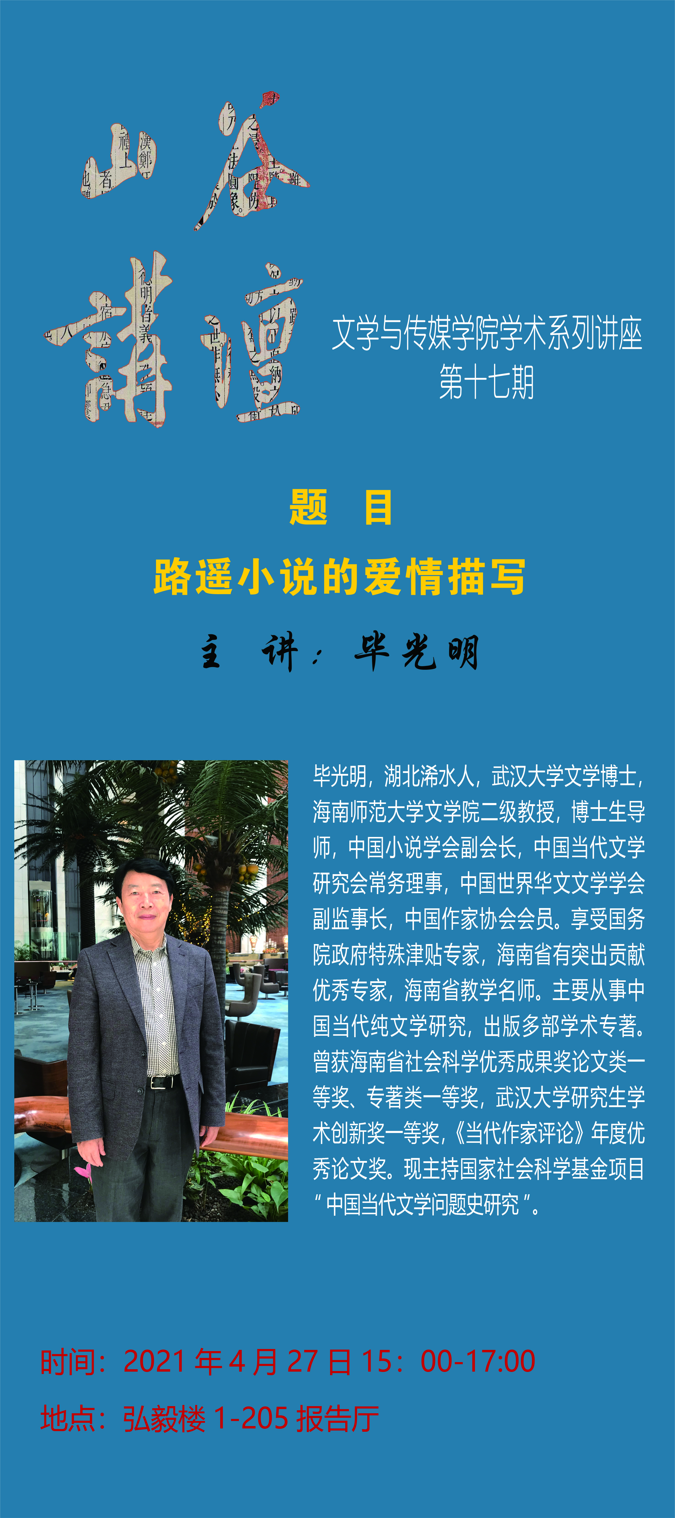 毕光明,湖北浠水人,武汉大学文学博士,海南师范大学文学院二级教授,博士生导师,中国小说学会副会长,中国当代文学研究会常务理事,中国世界华文文学学会副监事长,中国作家协会会员。享受国务院政府特殊津贴专家,海南省有突出贡献优秀专家,海南省教学名师。主要从事中国当代纯文学研究,出版有《文学复兴十年》《虚构的力量:中国当代纯文学研究》《批评的支点:当代文学与文学教育》《纯文学视境中的新时期文学》《纯文学的历史批判》等学术专著。曾获海南省社会科学优秀成果奖论文类一等奖、专著类一等奖,武汉大学研究生学术创新奖一等奖,《当代作家评论》年度优秀论文奖。现主持国家社会科学基金项目“中国当代文学问题史研究”。