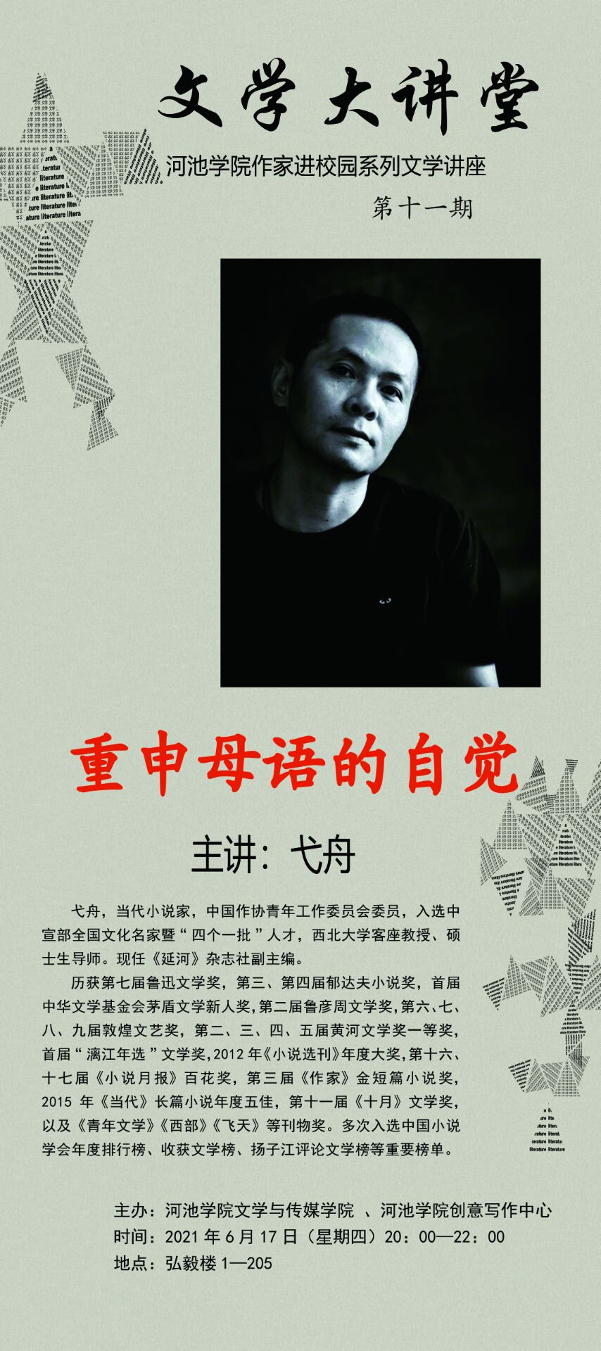 主讲人:弋舟,当代小说家,中国作协青年工作委员会委员,入选中宣部全国文化名家暨“四个一批”人才,西北大学客座教授、硕士生导师。现任《延河》杂志社副主编。历获第七届鲁迅文学奖,第三、第四届郁达夫小说奖,首届中华文学基金会茅盾文学新人奖,第二届鲁彦周文学奖,第六、七、八、九届敦煌文艺奖,第二、三、四、五届黄河文学奖一等奖,首届“漓江年选”文学奖,2012年《小说选刊》年度大奖,第十六、十七届《小说月报》百花奖,第三届《作家》金短篇小说奖,2015年《当代》长篇小说年度五佳,第十一届《十月》文学奖,以及《青年文学》《西部》《飞天》等刊物奖。多次入选中国小说学会年度排行榜、收获文学榜、扬子江评论文学榜等重要榜单。