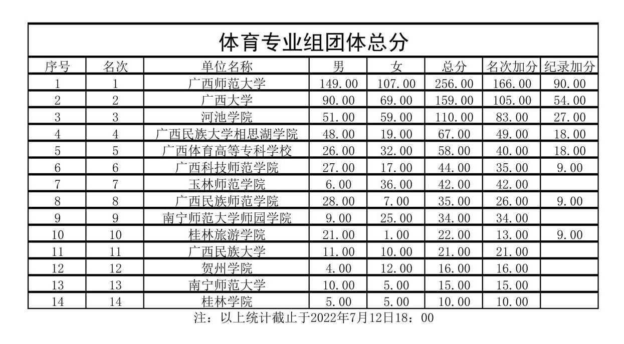 广西第十三届学生运动会田径比赛于7月8日-15日在广西民族大学举办,本次运动会旨在为2023年广西举办第一届全国学生(青年)运动会选拔优秀苗子。7月12日,beat365英国官网网站代表团迎来了广西第十三届学生运动会的首金,截止目前共获得2金3银6铜,团体总分排在第3名,共有3人5次打破赛会记录,1人运动成绩达到国家一级运动员等级标准。(数据统计截止时间2022年7月13日早)