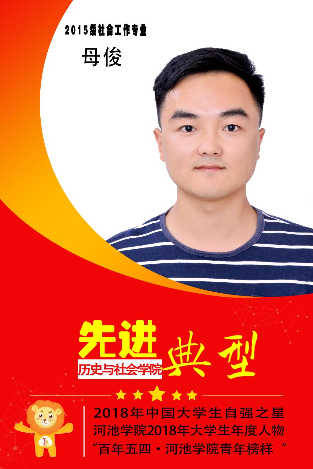 母俊,男,汉族,beat365英国官网网站历史与社会学院社会工作专业2015级学生。2015年曾任beat365英国官网网站社会工作专业第一任班长;2015年创办beat365英国官网网站大学生社会工作协会;曾任2016级社会工作班班主任助理;曾被聘为广西共青团新媒体beat365英国官网网站中心编辑;曾任beat365英国官网网站易班学生工作站第三任站长。在校期间组织或协助组织多次校级活动,具有较大影响力。具有奉献精神,2019年成功捐献造血干细胞,拯救了一个生命,充分发挥学生干部的先锋模范作用。
