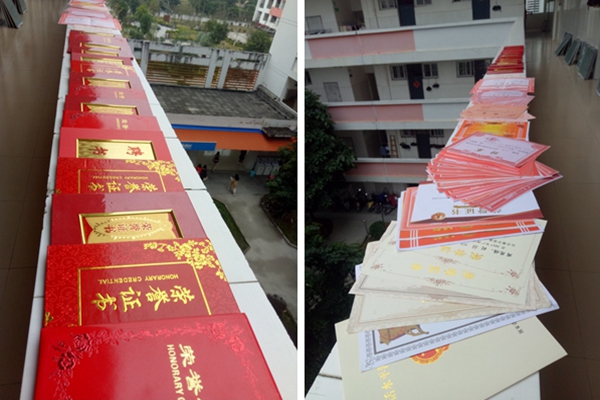 刘喆在公寓长廊上展示自己的奖状
