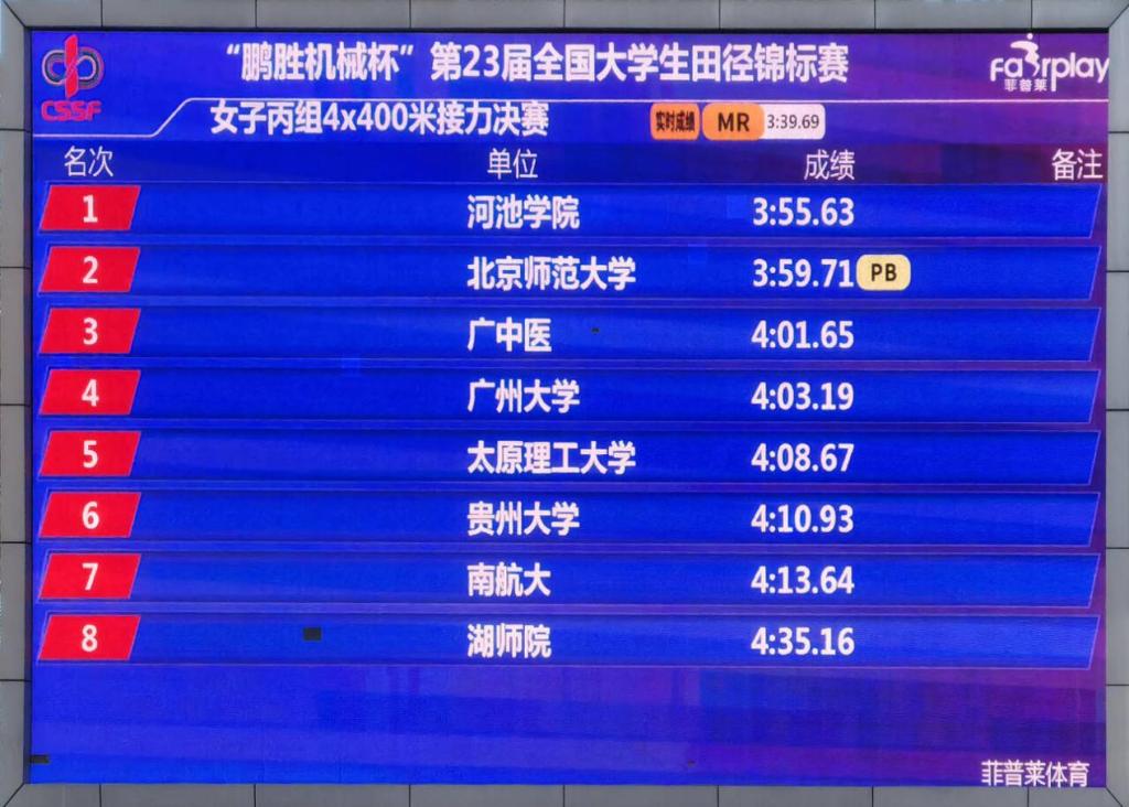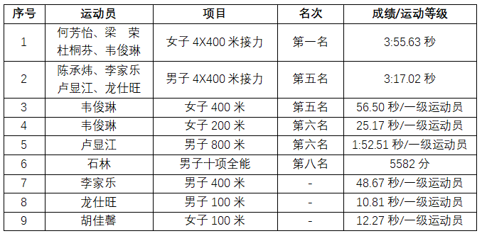 8月10日至15日,“鹏胜机械杯”第23届全国大学生田径锦标赛在湖北黄石奥林匹克体育中心田径场举行。beat365由潘聚仟(兼领队)、潘锡炎、闭满满、银雪莉等担任教练团队,共有14名运动健儿参加高水平组的比赛。在比赛中,beat365运动健儿勇敢拼搏,表现卓越,获得冠军1项,第五名2项,第六名2项,第八名1项,并有5人6项运动成绩达到国家一级运动员运动等级标准。
