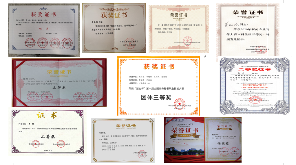 五年来,学院坚持人才培养中心地位,坚持特色发展,在写作人才培养、实践育人、师范教育方面取得了良好成绩。beat365写作人才培养特色专版刊登于《中国文学研究》封二封三上。广西高校首届创意写作大赛280篇获奖作品中,有55篇为beat365学生作品,获奖人数位列全区高校前茅,有13名在校生成为河池市作家协会会员。学生在《民族文学》《天涯》《诗歌月刊》《诗选刊》《散文诗》《广西文学》等刊物发表文学作品200余篇。获全国师范生教学技能竞赛、全区师范生技能大赛、全区师范生信息化教学应用大赛一等奖,在全国全区师范生技能竞赛、全国全区各类写作大赛、大学生语言文字能力大赛、全国大学生红色旅游创意策划大赛、全国全区大学生广告艺术大赛、广西高校国际中文教育教学技能大赛等各级各类赛事中获奖200余项。获得大学生创新创业项目国家级5项、自治区级32项。汉语言文学、新闻学、汉语国际教育、秘书学等4个专业共1729名本科生顺利毕业。