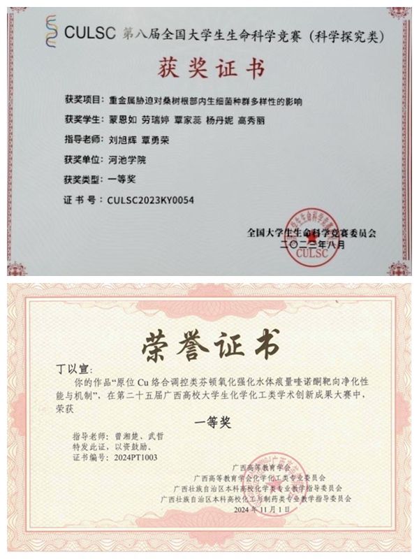 育人以教基为舟。升本以来,化生学院坚持立德树人根本任务,全力为党育人、为国育才,基于学校应用型高校办学定位和“扎根河池、服务地方、面向基层”的服务面向定位,秉持“学生中心、产出导向、持续改进”的理念积极进行教育教学改革。学院构建以“党建引领+地方红色文化+少数民族优秀文化+课程思政”为体系的大学生思想政治教育模式,培养了一批又一批忠于祖国、忠于人民、乐于奉献、具有扎根基层情怀、立志于服务民族地区发展的有志青年。在扎实做好师范类人才培养的基础上,结合“新工科”“新农科”、“新医科”建设及地方经济社会发展人才需求,聚焦为河池有色金属、茧丝绸“两个千亿集群”和食品、建材、化工、医药等“百亿产业”,以及生命科学和生物技术、大健康等“N个新兴产业”培养应用型创新人才。与广西农投时宜农业科技有限公司联合举办了“时宜桑蚕科技实验班”,与丹泉集团有限公司合建了“丹泉学院”,进行了微专业“蚕学种养与综合利用”和“酒类生产与营销”等一系列教学和人才培养改革。学科专业建设成果卓著,学院“生物与医药专业学位硕士”被列为2021-2025广西壮族自治区级硕士学位授权立项建设点,“生物化工”为广西重点学科,“应用化学”为广西高校重点学科,生物科学和应用化学为自治区级一流专业建设点;《分析化学》和《仪器分析》为自治区级普通本科高校课程思政示范课程;《动物学》《动植物野外实践》《广西生态环境保护》和《聚丙烯生产工艺操作过程虚拟仿真实验》为自治区级一流本科课程;“新农科实验教学中心”为自治区级实验教学中心;获批3个广西高等教育创优计划“自治区创新创业教育改革示范专业(制药工程)”“卓越制药工程师协同育人平台”“自治区大学生校外实践教育基地(木论国家级自然保护区)”。近年来,学院取得新世纪广西高等教育教学改革工程项目15项,荣获2023年广西高等教育自治区级教学成果二等奖。学生积极参加各种学科竞争,并取得优异成绩,其中在全国大学生生命科学竞赛获得一等奖1项、二等奖3项、三等奖3项;在全国大学生化工设计竞赛获得二等奖4项;在“国药工程杯”全国大学生制药工程设计竞赛获二等奖3项、三等奖6项;在全国大学生数字素养与技能大赛获特等奖3项、一等奖1项、二等奖2项,省部级奖项近百项。学生就业率连年达优,人才培养质量显著提升。学院团委获得广西“五四红旗团总支”光荣称号,社会实践志愿服务队多次获得先进集体称号和自治区优秀团队称号。