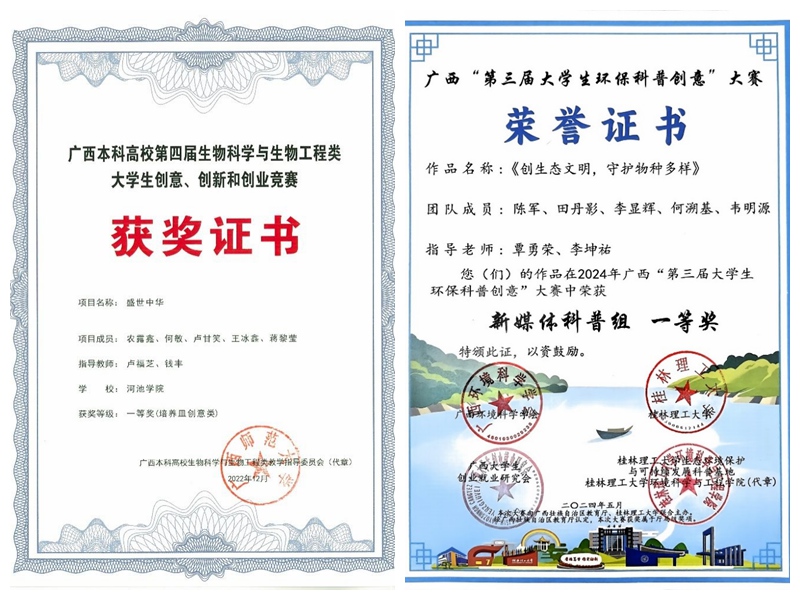 育人以躬行证道。学院师生积极服务地方蚕桑产业、白酒产业、水产业、环境污染治理、生物多样性保护等,得到政府、企业、行业和农民的高度认可。其中师生服务蚕桑产业被评为2022年度广西科技体制改革五个典型案例之一,其校企合作创新养蚕模式先后被人民网、新华网等各级媒体追踪报道,合作企业广西农投时宜农业科技有限公司2022年被评为第三批产教融合型试点企业。师生为河池酿酒企业建设白酒制曲示范基地,形成白酒酿造集成应用技术1项,为企业培训技术人员230人次;在2012年龙江河镉污染事件应急处置中,刘旭辉和覃勇荣两位教授受河池市政府的邀请担任现场应急处置专家,发挥了关键技术支撑作用;韦岩松教授撰写的咨政报告《中国铟资源安全研究报告》,受到时任国务院副总理的批示。十多年来师生助力木论国家级自然保护区建设,促成木论保护区成功加入全球环境基金项目和申报世界自然遗产地。在此过程中,我院3位老师参加CCTV-10科教频道《地理中国》栏目《寻找“地下金”》录制,多次活动受到官方媒体相继报道;近年来师生培训产业技术人员600多人次,科技服务农户1000余户。近十年来学生在河池喀斯特地区采集并制作植物标本1.5万余份,动物标本20万余份,自建了具有喀斯特生物多样性特色的动物博物馆、植物标本馆、种桑养蚕科普体验馆等科普平台,每年接待和科普服务地方群众和中小学生5000余人次,以知行合一诠释“把论文写在八桂大地上”的担当。