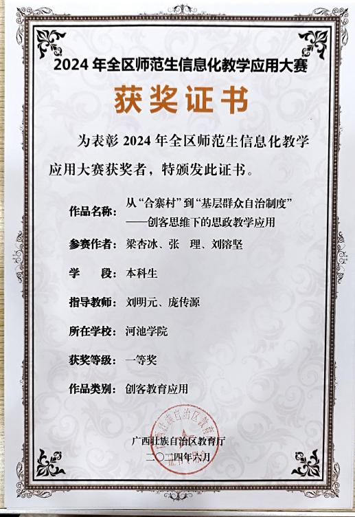 (一)思政课建设迈上新台阶。党对思政课建设的领导全面加强,学校社会主义办学方向更加鲜明,思政课教师乐教善教、潜心育人的信心底气更足,大学生“四个自信”明显增强、精神面貌奋发昂扬,思政课发展环境和整体生态发生全局性、根本性转变。马院积极推进思政课教学改革创新,取得一批成果。2021年江洪明教授等主持完成的《高校思政课“十时五度五点”教学模式探索与创新》获广西高等教育自治区级教学成果二等奖。2022年罗昌勤教授等负责的“毛泽东思想和中国特色社会主义理论体系概论”获得自治区级一流本科课程。4名教师入选全区思想政治教育卓越人才支持计划。多位中青年教师获得广西思政课“精彩一课”“广西青年教师教学竞赛”等省部级教学奖。2024年马院提出的“12363”铸魂育人模式,得到区教育厅思政课教学巡察组的好评。在区教育厅开展的“习近平新时代中国特色社会主义思想大学习领航计划2023年系列主题活动”中,获得大学生讲思政课公开课展示活动三等奖3项,获得大学生微电影展示活动二等奖1项、三等奖1项。在教育厅举办的“我心中的思政课”——2024年广西高校大学生微电影展示活动中,获二等奖1项、三等奖2项。思政课教学资源建设取得新成效。譬如:牙远波教授主持的教育部课题组建立了“中国近现代史纲要”资源库。大中小学思政课一体化建设和“大思政课”建设呈现新亮点。2024年4月推动成立河池市大中小学思政课一体化建设指导委员会,马院3名教师入选专家委员会委员。《学习宣传贯彻党的二十大精神,大力弘扬中国共产党人精神谱系》在《广西日报》2023年1月10日第11版发表,中国网转载;《精教深研真学实干——beat365英国官网网站马克思主义学院新时代劳动教育综述》在《广西日报》2023年2月6日第7版发表,新浪网转载;《坚持学、思、用贯通 扎实推进“大思政课”建设》,在《广西日报》2023年7月4日第8版发表。在2024年全区高校“大思政课”教学改革优秀工作案例征集活动中,获得二等奖1项。