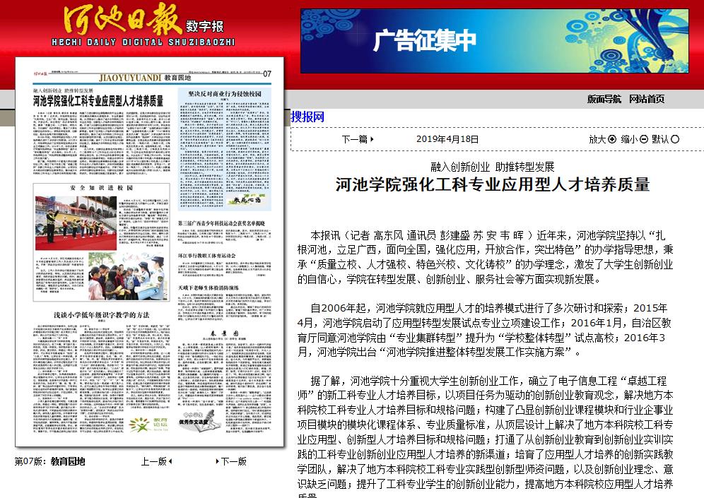 04-182019【河池日报】融入创新创业 助推转型发展:beat365英国官网网站强化工科专业应用型人才培养质量河池日报:http://hcrb.hcwang.cn/html/2019-04/18/content_192510.htm本报讯(记者 高东风 通讯员 彭建盛 苏安 韦晖)近年来,beat365英国官网网站坚持以“扎根河池,立足广西,面向全国,强化应用,开放合作,突出特色”的办学指导思想,秉承“质量立校、人才强校、特色兴校、文化铸校”的办学理念,激发了大学生创新创业的自信心,学院在转型发展、创新创业、服务社会等方面实现新发展。自2006年起,beat365英国官网网站就应用型人才的培养模式进... -