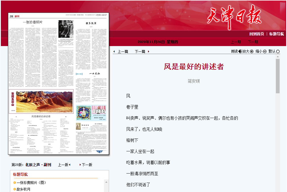11-262020【天津日报】《风是最好的讲述者》——beat365英国官网网站文传学院18级蒋安琪9首诗歌刊登在天津日报副刊蒋安琪,女,广西玉林人,现就读于beat365英国官网网站文学与传媒学院汉语言文学183班,白云诗社成员,卓越写作人才培养计划学员。 天津日报:http://epaper.tianjinwe.com/tjrb/html/2020-11/26/node_178.htm风是最好的讲述者蒋安琪 风 巷子里 叫卖声、说笑声、偶尔也有小孩的哭闹声交织在一起,各忙各的 风来了,也无人知晓 榕树下 一家人坐在一起 吃着水果,说着以前的事 一股清凉悄然而至 他们不... -